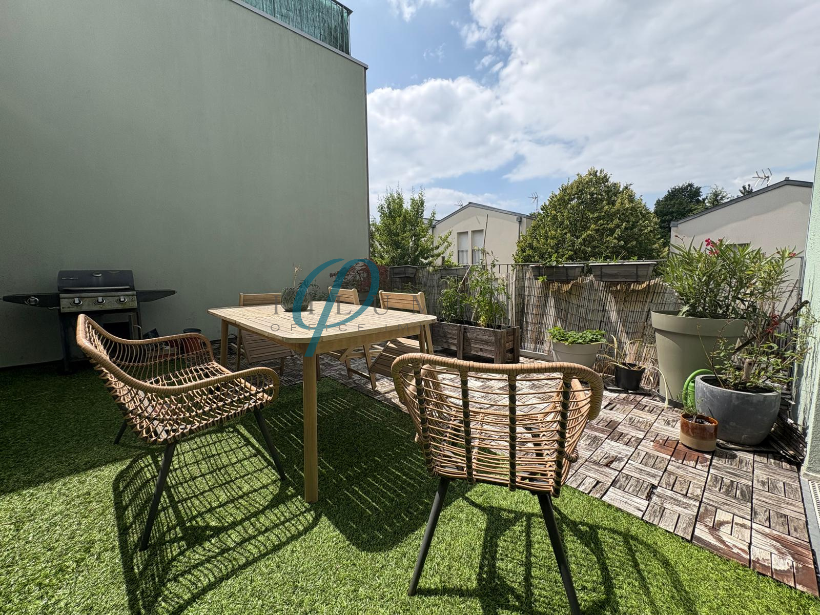 Une grande terrasse ensoleillée, assez spacieuse pour y installer une table pour 6 personnes, parfaite pour les repas en plein air