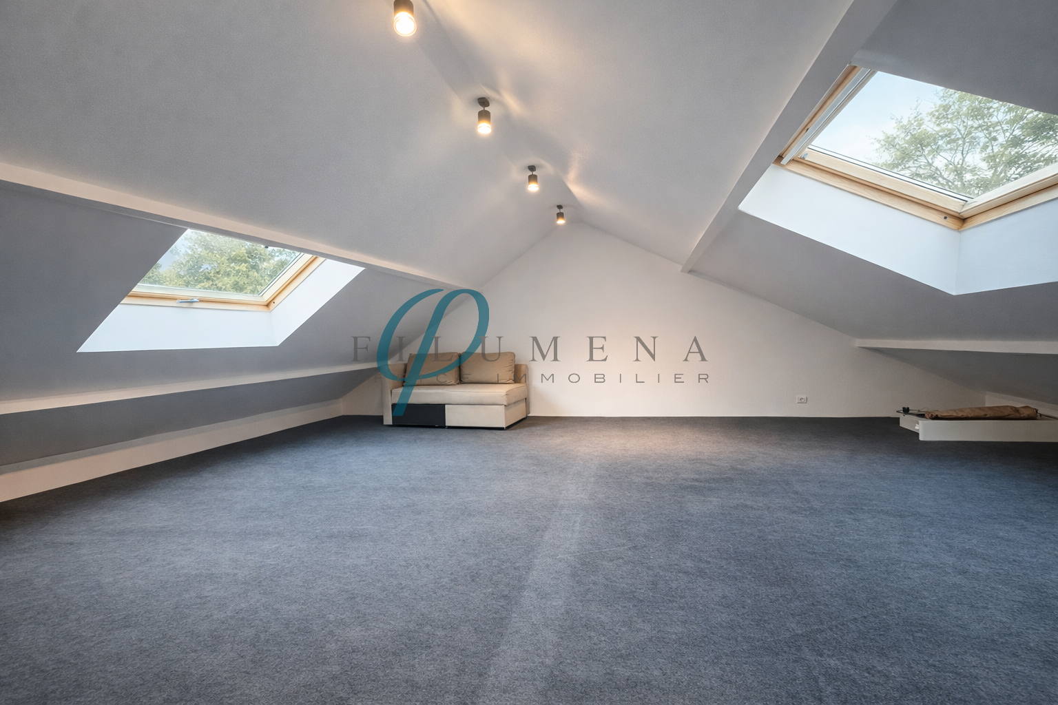 À l’étage, l’espace nuit propose 4 chambres, 2 dressings, une salle de bains avec baignoire et douche, ainsi que 2 WC indépendants, offrant confort et intimité à toute la famille. Une salle de jeux d’environ 40 m² au sol complète cet espace, idéale pour les enfants ou un espace loisirs.