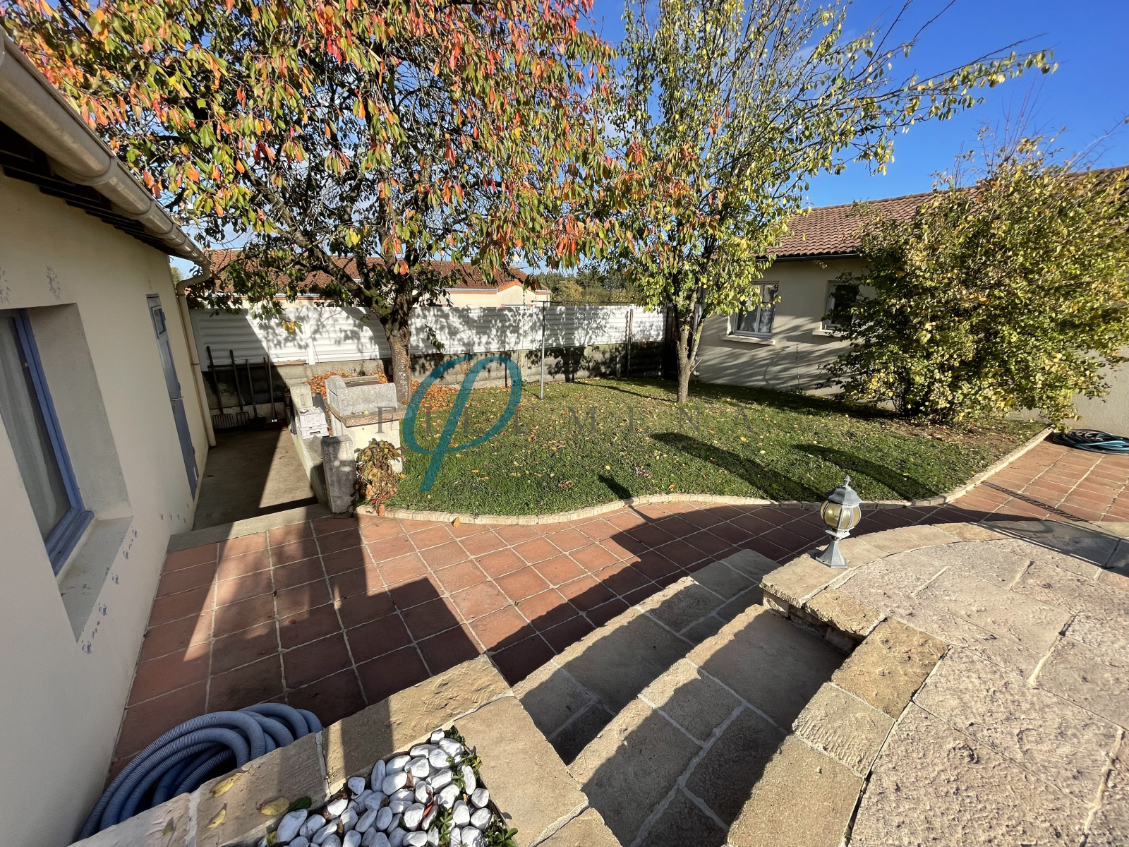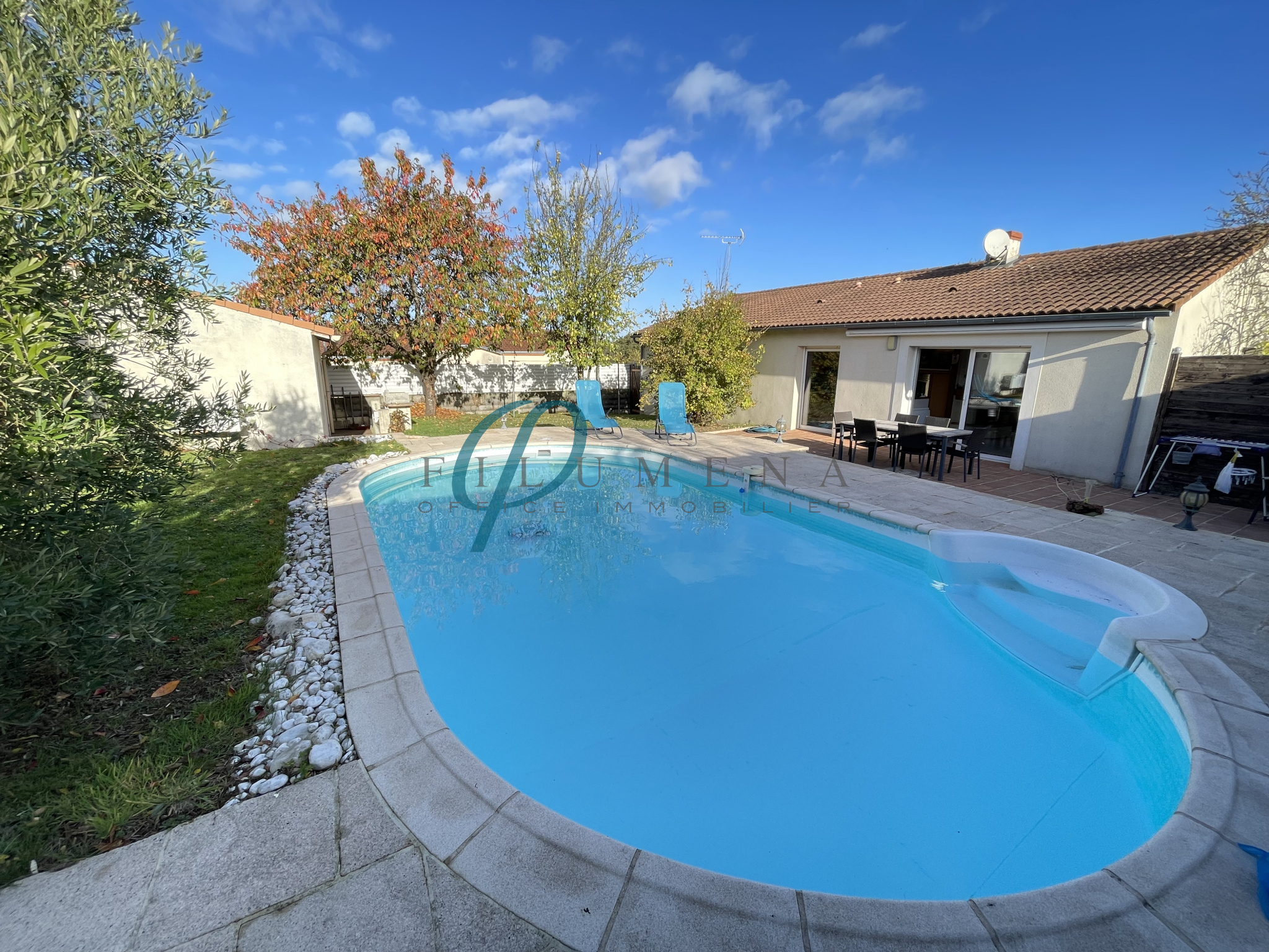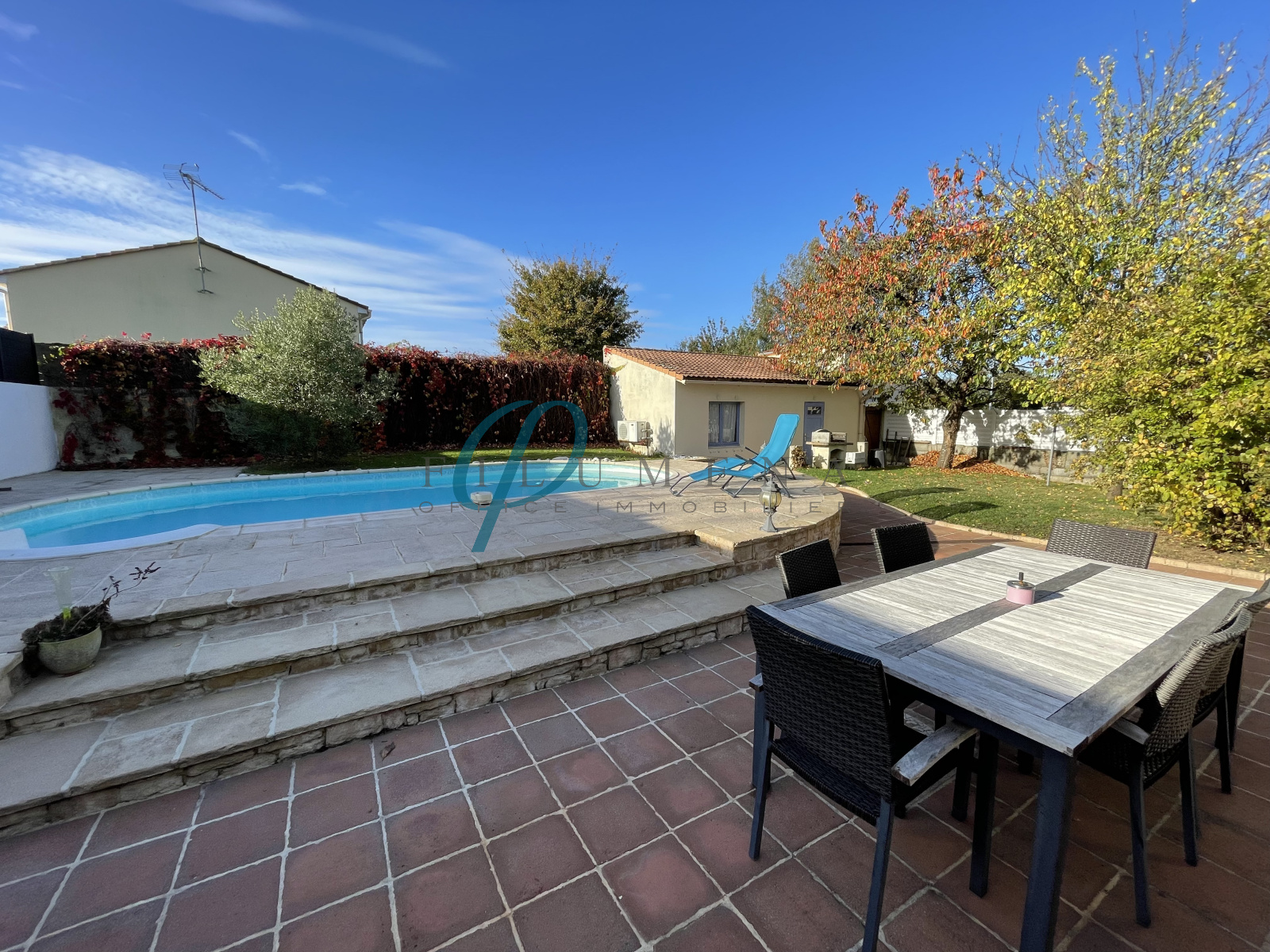 A l'extérieur, un jardin clos et paysagé offrant une grande terrasse avec son store-banne, une piscine traditionnelle et un garage avec le local technique.